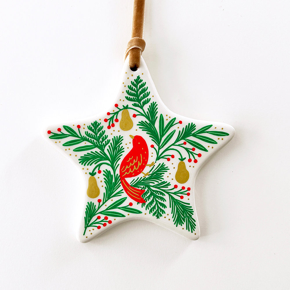 Star Ornament - Partridge in a Pear Tree - Gold Velvet Ribbon