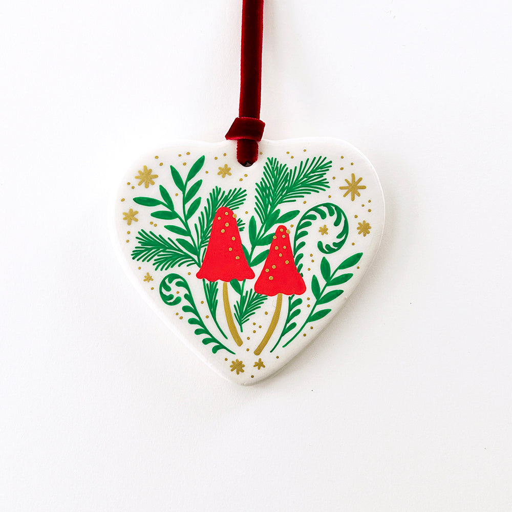 Heart Ornament - Little Mushrooms - Red Velvet Ribbon
