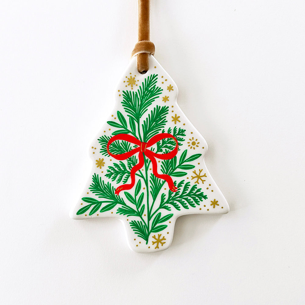 This hand-painted ornament is one of a kind, hand painted and finished with a luxe velvet ribbon, ready for hanging on your tree. Ceramic base.
